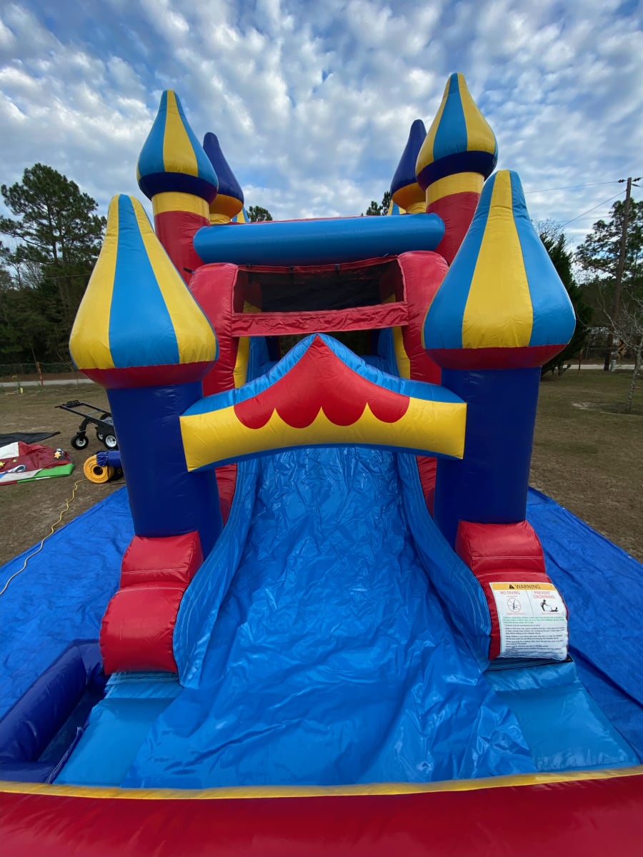 Featuring a carnival themed single lane combo dry slide attached to a bounce house with basketball hoop inside, the Carnival Combo offers three-party activities in one unit. That means more play, less setup, and better value. Perfect for children ages 3+ with supervision at all time.