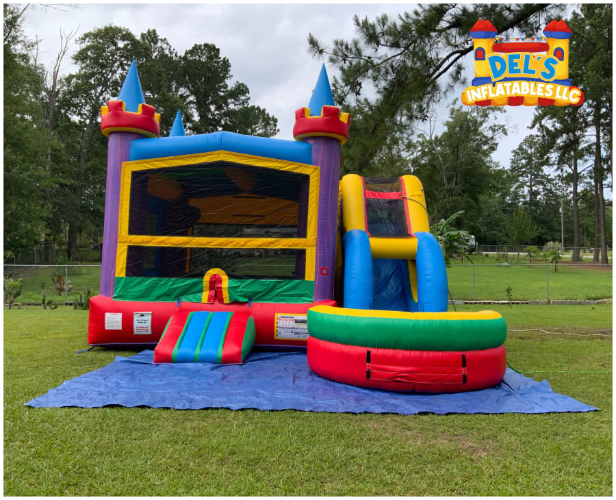 This setup blends four attractions into one unit. One easy reservation gives you hours of active play. The integrated basketball hoop encourages friendly competition. The pool at the end is ideal for hot days. The single lane keeps traffic organized and safe.