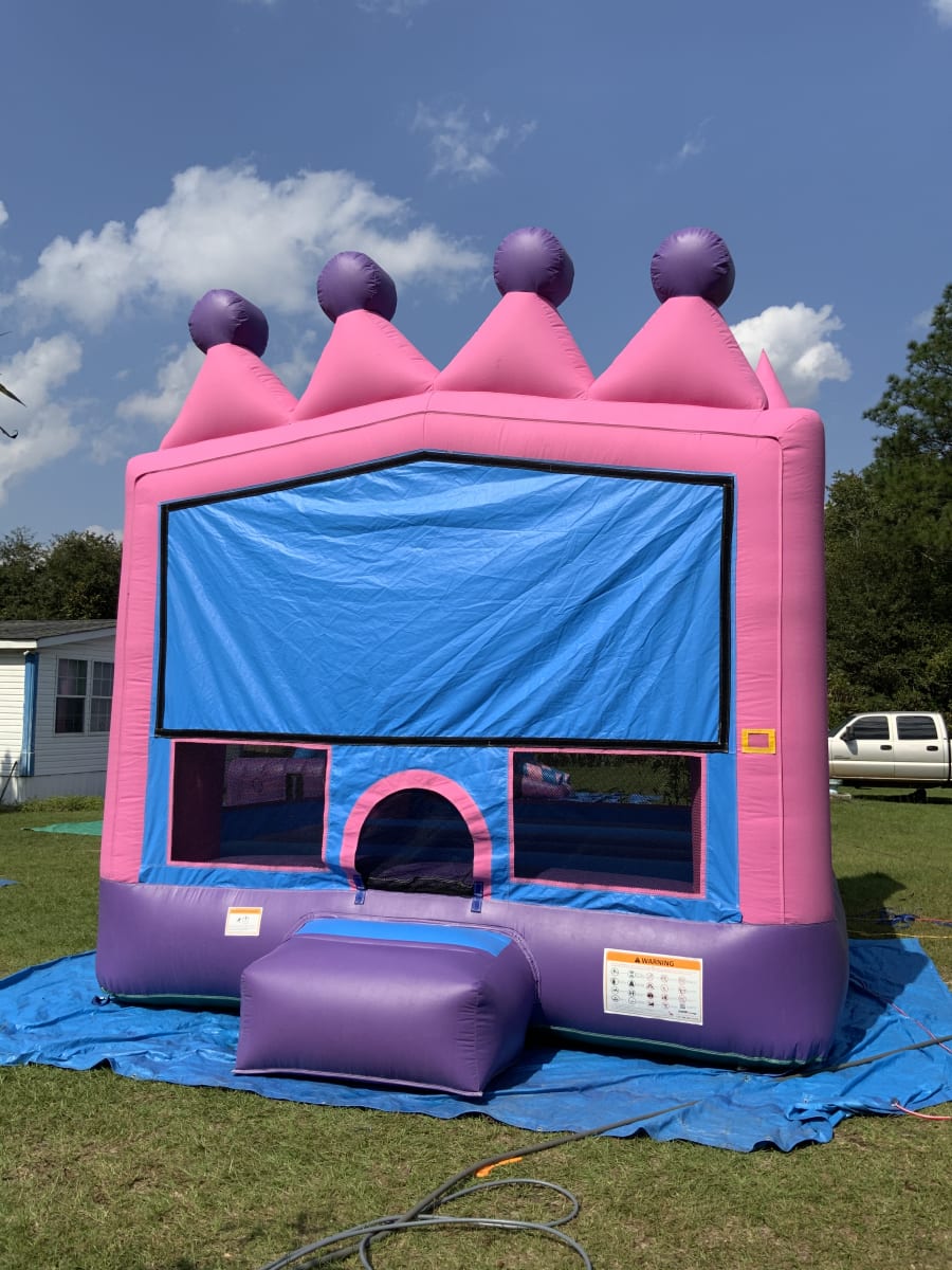 Our Princess Bounce House has a vibrant pink, blue, and purple color with a princess crown! This bounce house area is a 13x13 that includes a basketball hoop inside! It is a suitable bounce house for kids and adults. This unit is powered by a 1.0 HP blower that can be connected to one outlet. Princess bounce house is the perfect unit to make your next event one to remember!