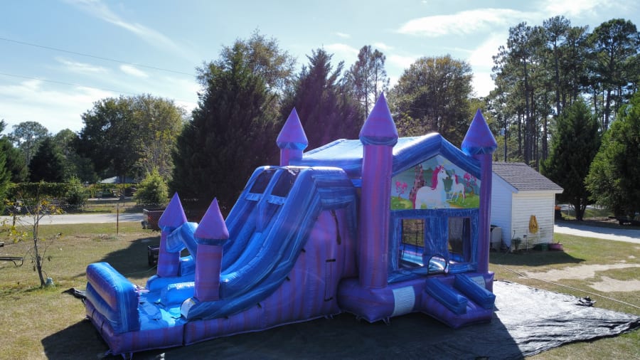 This combo blends visual appeal with high-play value. Children love racing down the double lane and finishing on the dry bumper. The basketball hoop adds variety and keeps kids engaged longer. The unicorn banner adds a storyline to your party décor. Rentals include professional setup and takedown. Reliable performance every event.