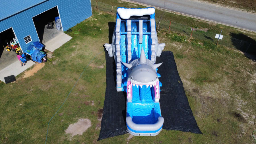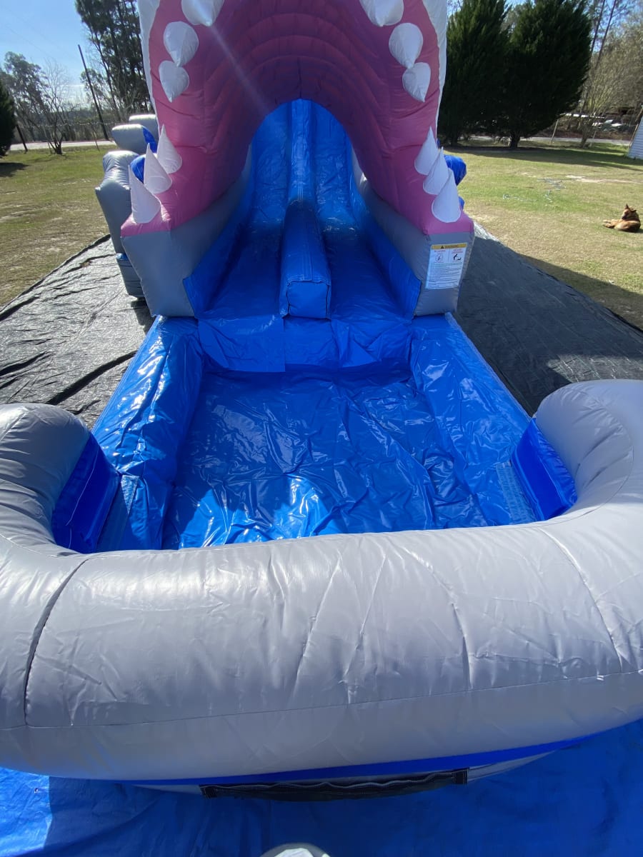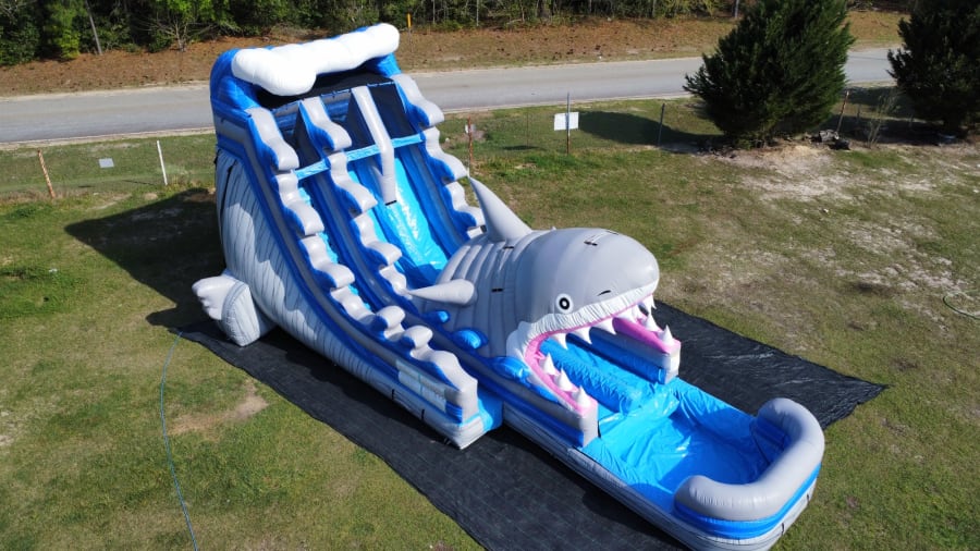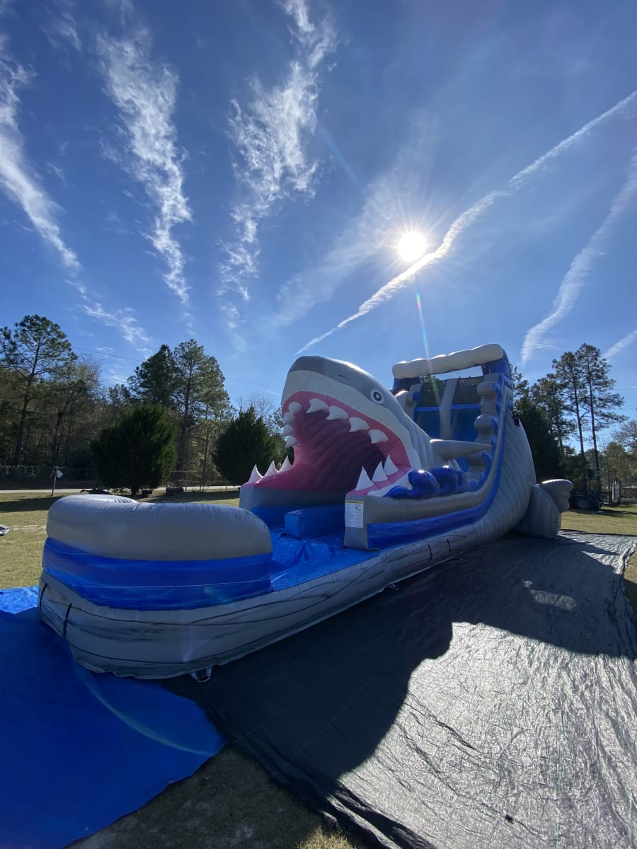 The 20ft Jaws Hybrid Dual Lane delivers big thrills for backyard parties, rentals, and events. This shark-themed slide combines speed and safety. It features two lanes, a pool, and a built-in misting system for nonstop fun. Use it for summer events, carnivals, or family gatherings o any event!