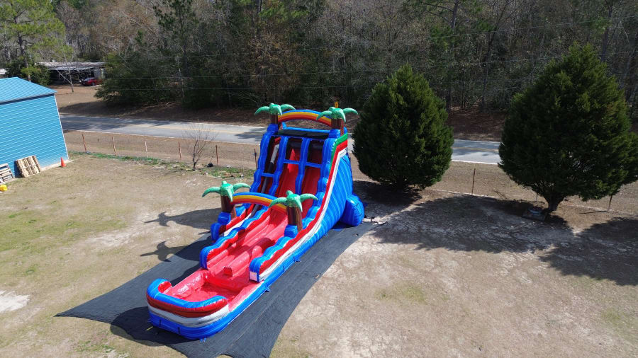 The 18ft Tropical Hybrid delivers headline-grabbing fun. This 18ft double lane waterslide red and blue tropical theme with pool at the end hybrid is built for fast races, splash landings, and picture-perfect parties. Bright tropical graphics. Two wide lanes. A splash pool finish. Simple setup. Durable vinyl. Safe design. Perfect for summer events, rentals, and family backyards.